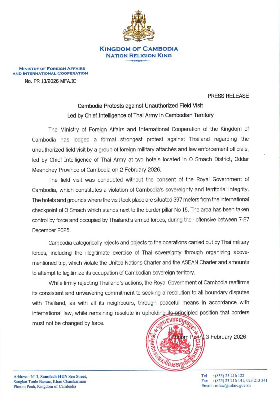 Cambodia Protests against Unauthorized Field Visit Led by Chief Intelligence of Thai Army in Cambodian Territory]